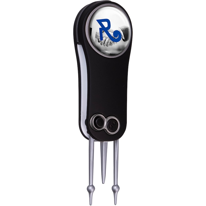 Arreglapiques avanzado de gran calidad. El arreglapiques St Andrews usa la tecnología patentada RepAirTec para recomponer el césped de forma rápida y sencilla. Se abre de manera automática y se cierra de forma manual. También incluye un botón marcador magnético y un sacapuntas. La impresión digital se realiza en el botón y se cubre con una capa protectora de epoxi.