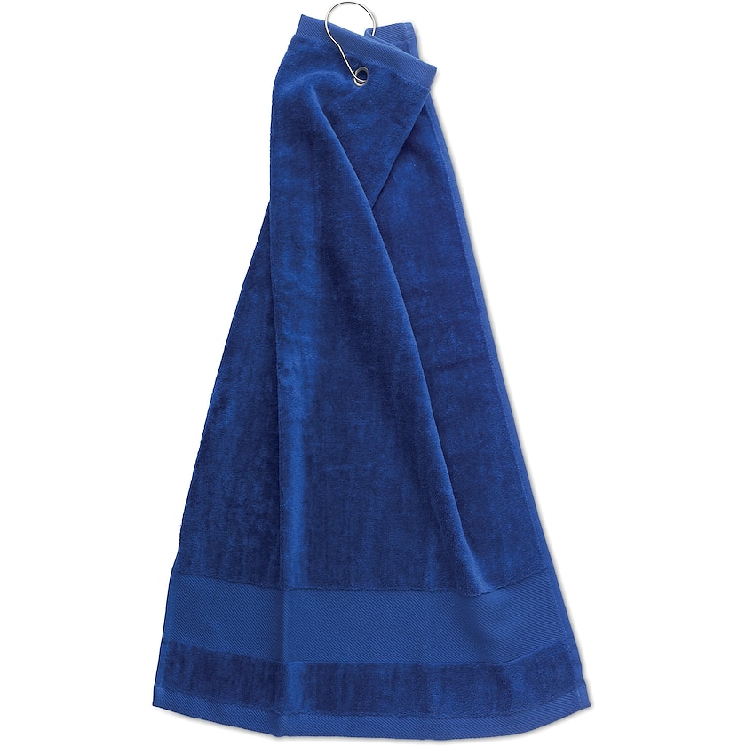 Toalla de golf de algodón. En la parte superior tiene una anilla de cobre para colgar la toalla en la bolsa de golf. El tejido tiene una densidad de 350 gramos/m².