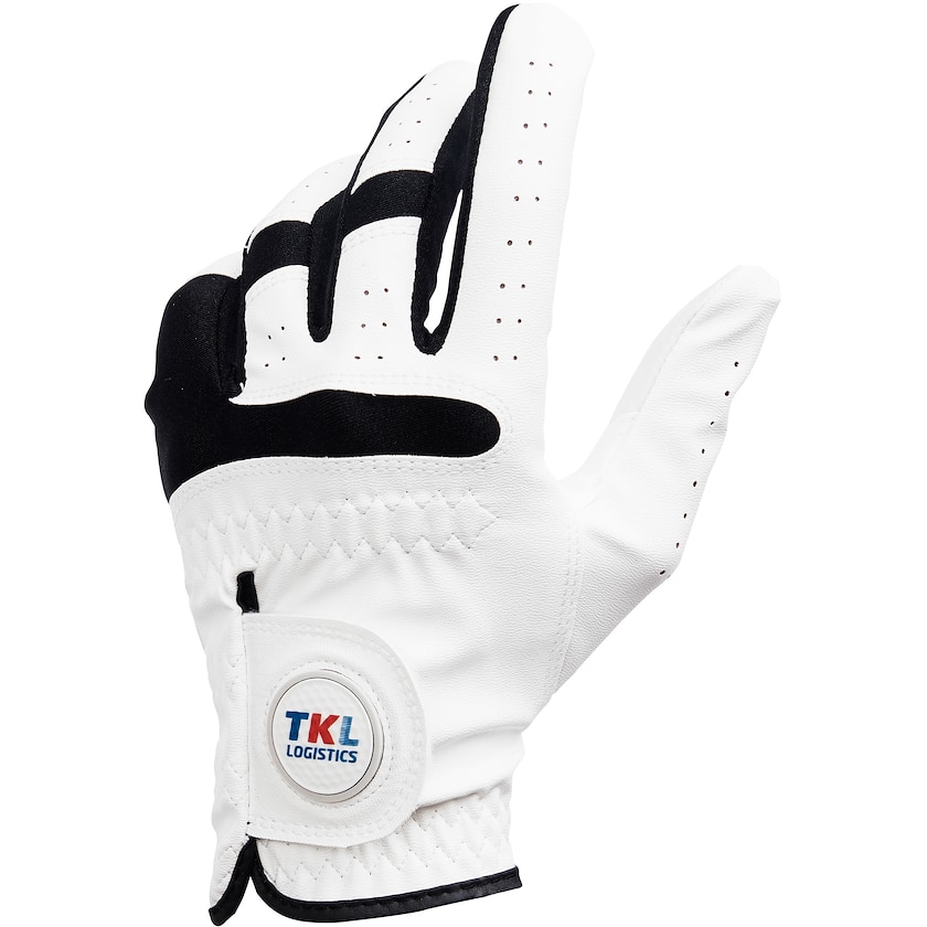 Guante de golf con marcador. El guante es versátil y está reforzado con remates de cuero en la palma y en el pulgar. Gracias al añadido de licra negra, el guante se ajusta perfectamente a la mano. El marcaje se realiza con impresión digital en el marcador, que se fija con un imán. Es posible mezclar diferentes tallas de hombre para mano izquierda/derecha entre S, M, M/L y XL, y de mujer para mano izquierda en tallas S, M y L.
