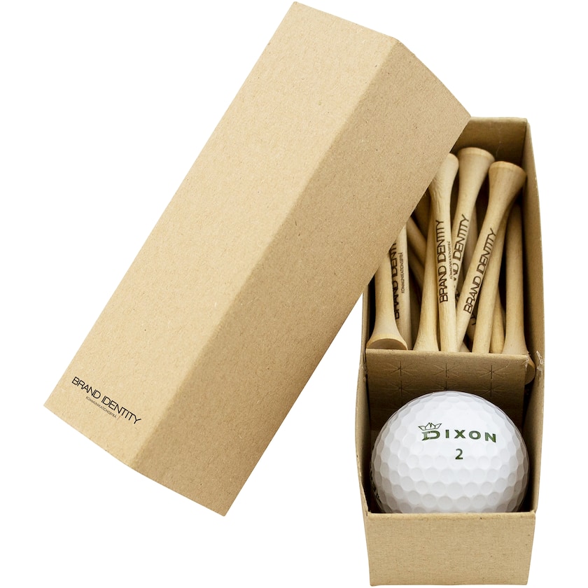 Set de pelota de golf y tees de madera. La pelota de golf es del tipo Dixon Earth. El set contiene 20 tees. El precio de impresión cubre la impresión en la pelota, en los tees y en la caja. La impresión se realiza en un color.