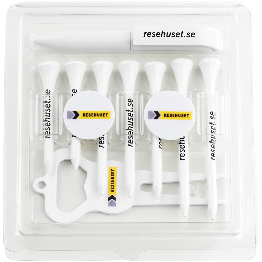 Set de accesorios de golf en envase de regalo. El juego contiene siete tees de madera de tres longitudes diferentes, dos marcadores, un arreglapiques y un lápiz. La impresión se realiza en todos los accesorios.
