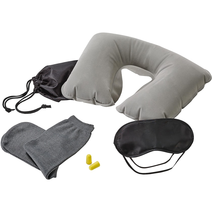 Kit de viaje con todo lo necesario para viajar con comodidad. El set incluye almohadilla hinchable, antifaz, tapones para los oídos y calcetines. Se entrega en una bolsa negra.