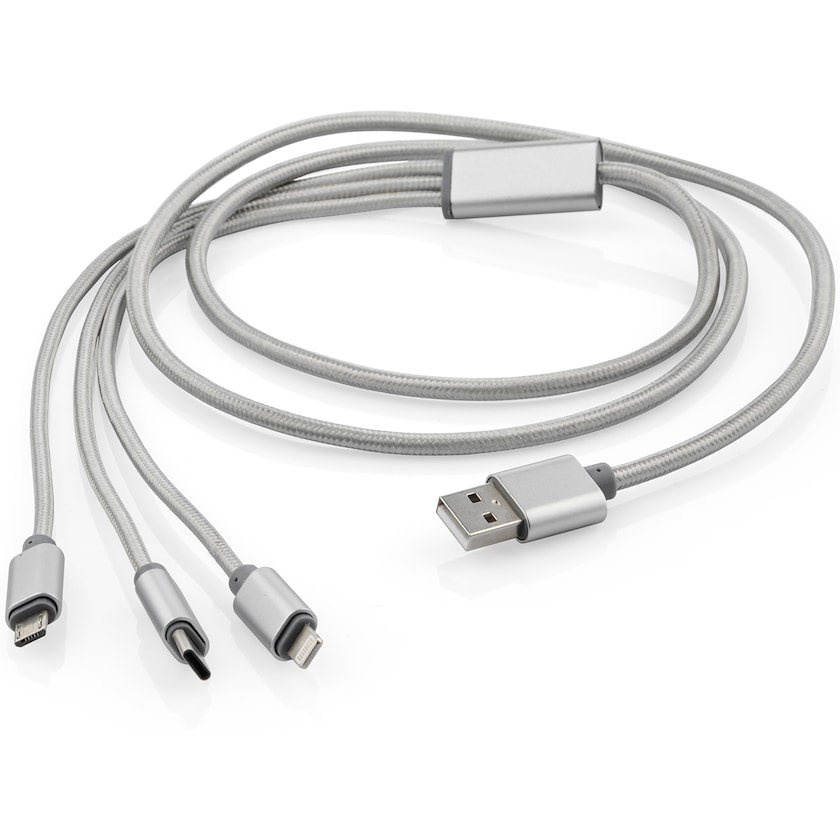Cable para móvil con tres conectores diferentes. Mega tiene salida tipo C, salida micro USB y salida para iPhone 5 y posteriores. El marcado se realiza con grabado láser.