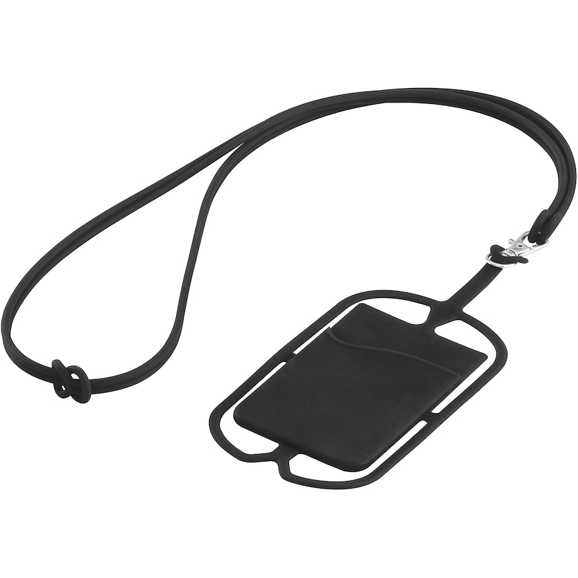 Bolsillo para móvil de silicona que se fija al móvil. El portatarjetas tiene una cinta para llaves extraíble. Está disponible en varios colores.