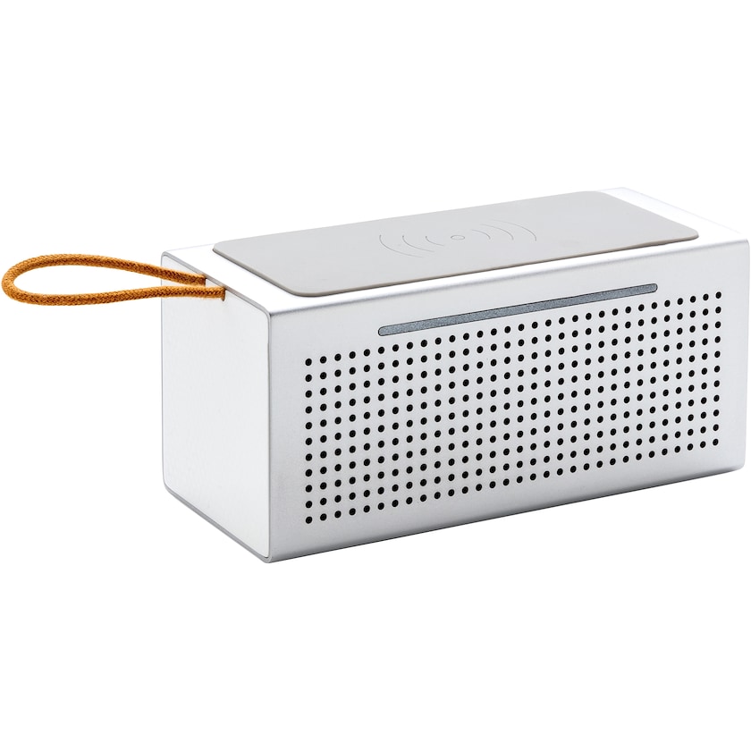 Altavoz de 6W que también sirve como cargador inalámbrico. El altavoz tiene un sonido fantástico y un tiempo de reproducción de 8 horas. Si se quiere cargar al mismo tiempo, se debe enchufar el altavoz a la corriente eléctrica. Incluye micrófono que permite usarlo para llamadas telefónicas. Diseño registrado®.