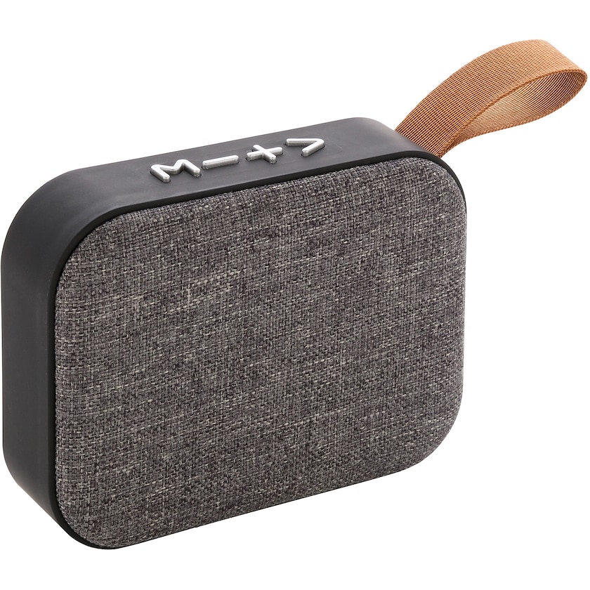 Cargador inalámbrico con parte frontal de tela. La batería permite hasta 3 horas de reproducción con una carga y el altavoz tiene un alcance de hasta 10 metros del dispositivo. Se incluye cable micro USB. Compatible con todos los móviles.