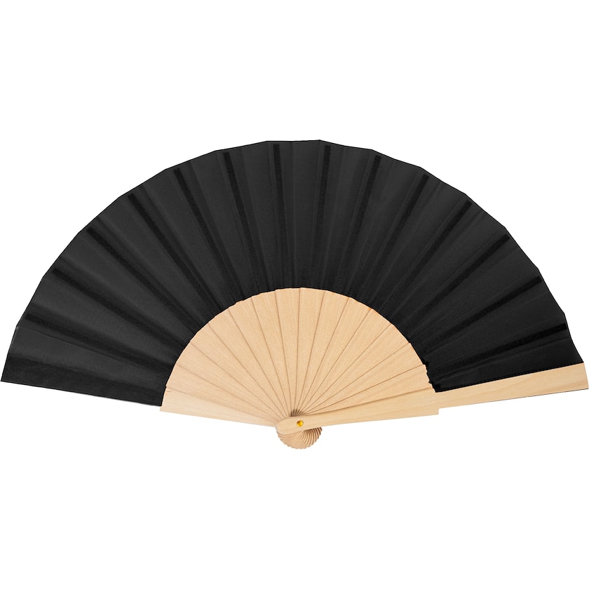 Abanico de madera con tela de rPET ecológico. El marcado se realiza mediante impresión o grabado láser en la barra exterior de madera.