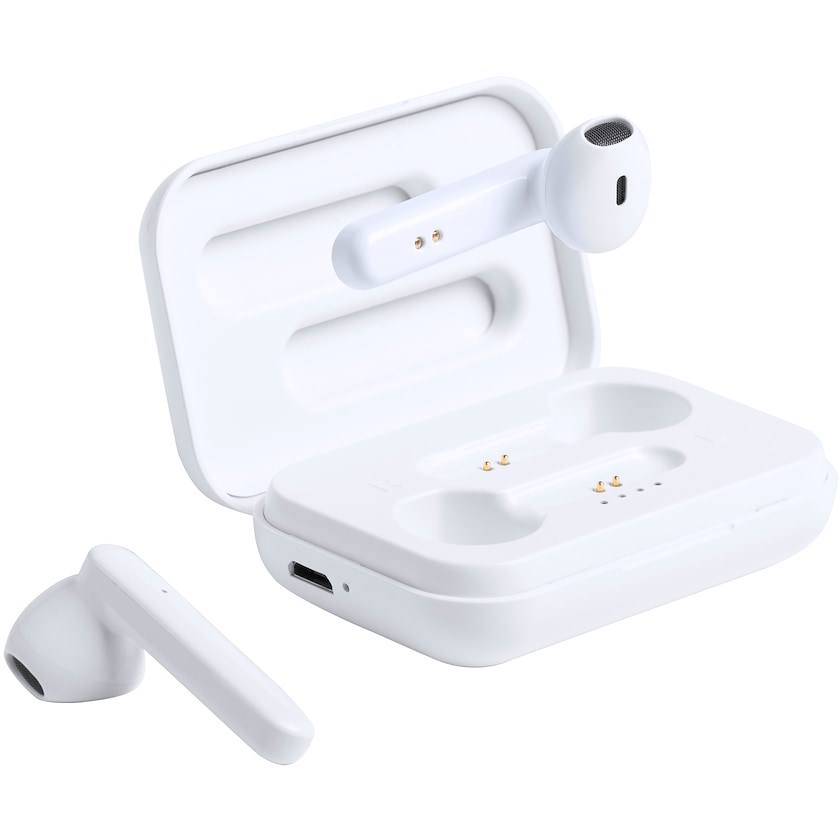 Auriculares inalámbricos con funda. Los auriculares se cargan en la funda. Cable USB incluido.