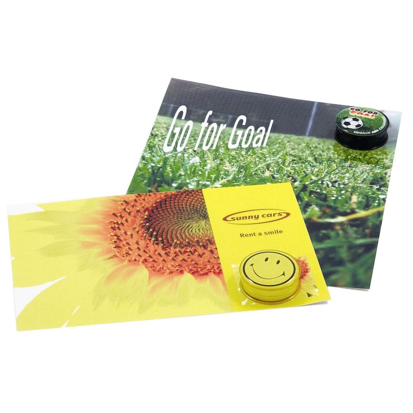 Pequeño envase con 3 gramos de bálsamo hidratante junto con una tarjeta con impresión digital. La tarjeta se imprime en ambos lados y puede tener diseños diferentes. En la tapa del envase se coloca una etiqueta con impresión digital de tu diseño. Perfecto para el correo publicitario.