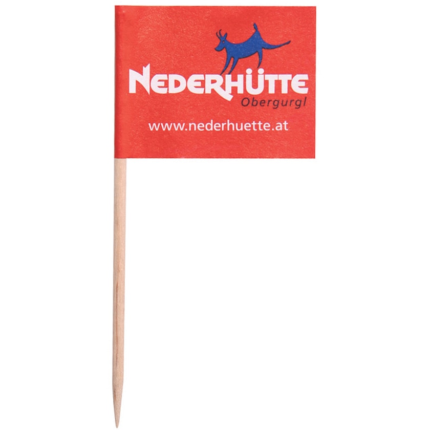 Banderines de cóctel personalizados con logo. Los banderines están fabricados en papel offset y están unidos a una vara de madera de unos 80 mm de largo. Los banderines se imprimen por ambos lados y pueden tener un diseño diferente. Se compran en packs de 1000 unidades.