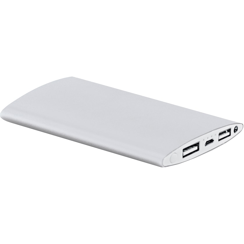 Powerbank económica de aluminio. La batería tiene 2 puertos USB. Input/outpur: 5V/1A. Incluye cable micro USB. Se entrega en una caja blanca. El marcado se realiza con grabado láser.