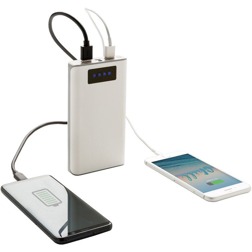 Potente powerbank de 10000 mAh. La powerbank tiene un indicador de batería que muestra el nivel de batería restante (25% –50% -75% –100%). Tiene dos salidas USB, lo que permite cargar dos dispositivos a la vez. Output: 5V/2.6 A, input 5V/2A. Incluye cable micro USB.