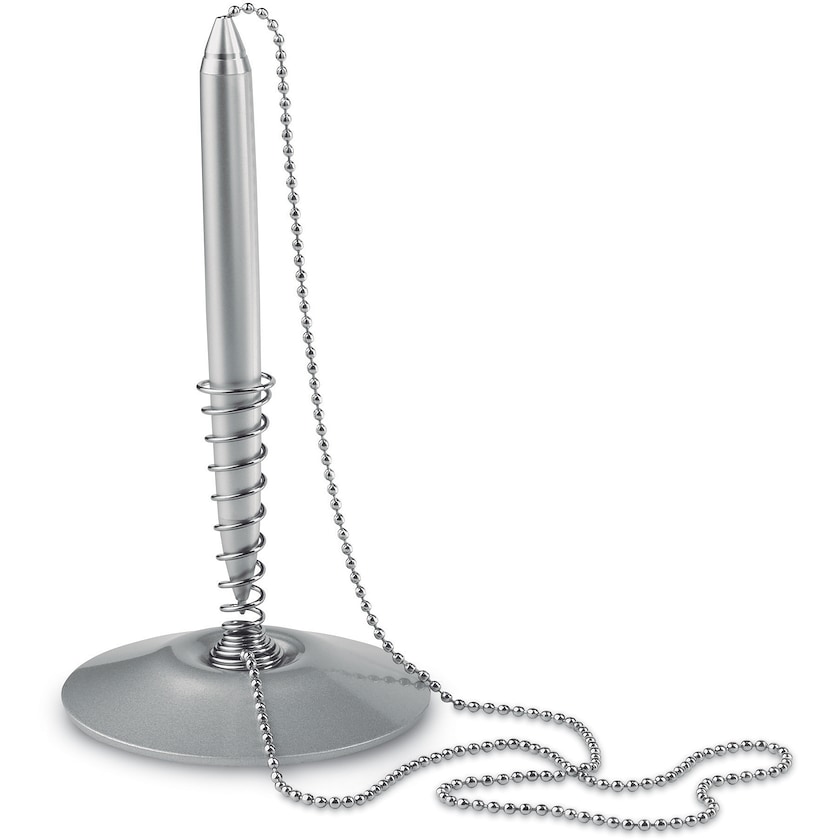 Bolígrafo con cadena y soporte en espiral. Un bolígrafo elegante de aluminio con tinta azul.