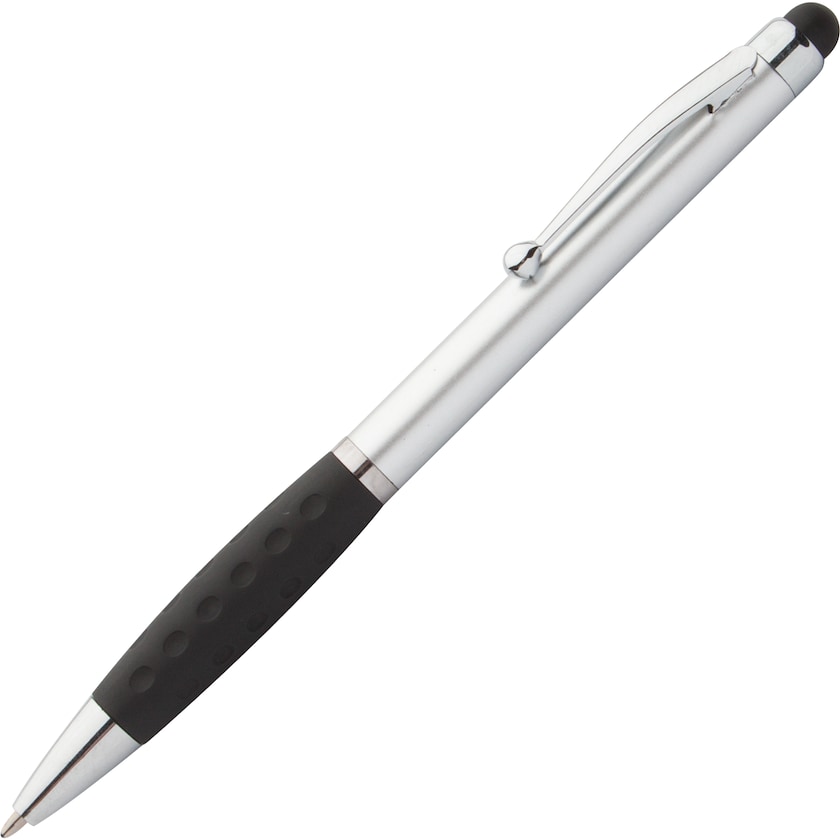 Bolígrafo táctil con empuñadura. El bolígrafo tiene elegantes detalles cromados y cartucho de tinta azul.