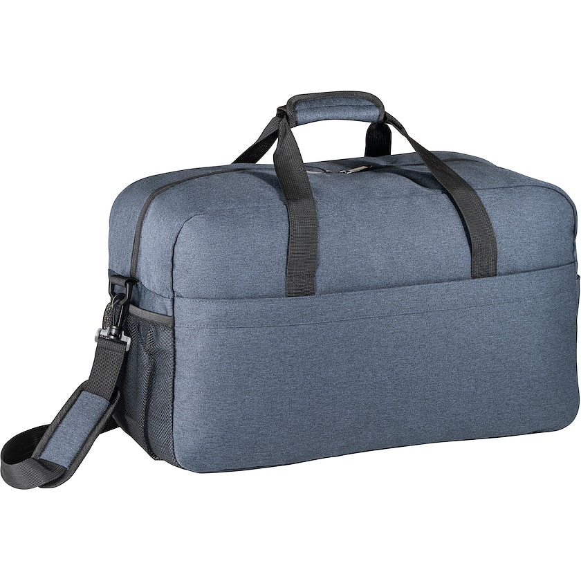 Bolsa de deporte ecológica de rPET. El espacio principal y el bolsillo frontal tienen cremallera. En los laterales hay bolsillos de red y otro bolsillo con cremallera. El rPET se elabora a partir de botellas PET recicladas.