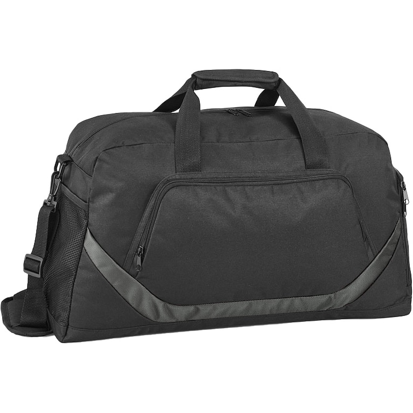 Bolsa de deporte personalizada grande. La bolsa West Hills tiene forro en el interior y fondo rígido. En la parte frontal hay un bolsillo con cremallera. En los laterales tiene un bolsillo de red y otro bolsillo con cremallera. La correa está acolchada y es ajustable.