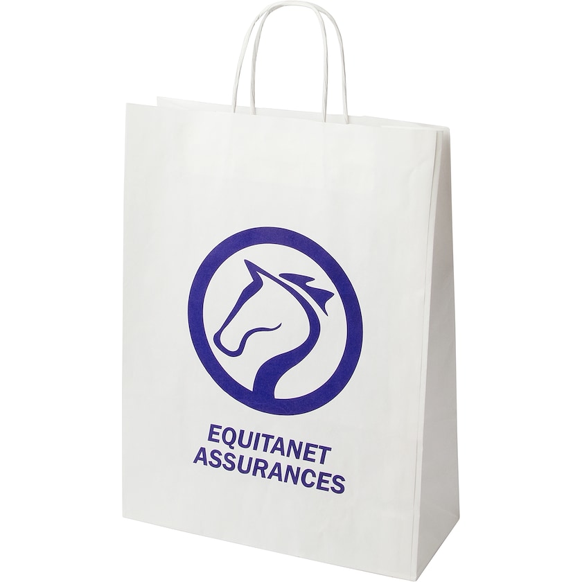 Bolsa de papel personalizada con asas retorcidas. La bolsa tiene la superficie lisa y soporta hasta 15 kg. El precio de impresión hace referencia a la impresión en uno de los lados.