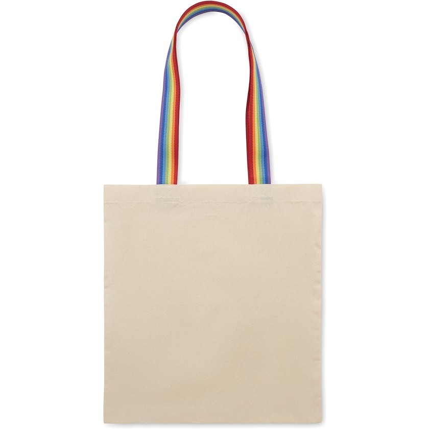 Bolsa de algodón con asas con colores de arcoíris. La tela está hecha de algodón de 180 gramos. El peso máximo es de 2,5 kg.