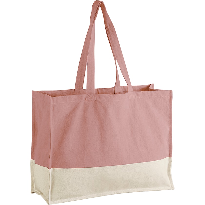 Bolsa de algodón grande con tejido de algodón ecológico de 407 gramos. El tejido de la bolsa tiene un efecto lavado "crinkle washed". La parte inferior es de otro color y le da un aspecto único. Se puede llevar en la mano o colgada del hombro.