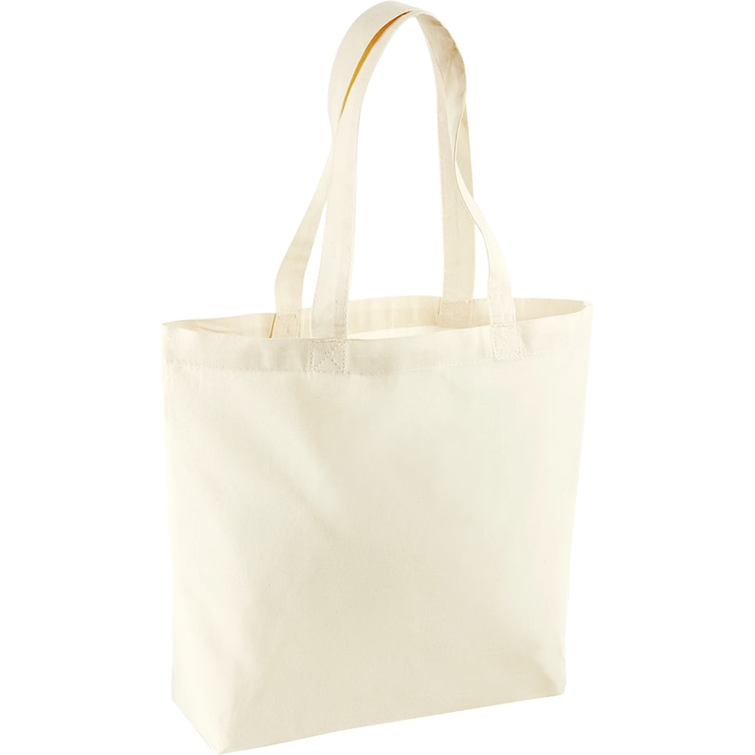 Bolsa de tela resistente fabricada en algodón ecológico 100%. La caja tiene una tela de color natural con una base ancha. Las asas son largas para poder llevar la bolsa en la mano o en el hombro.