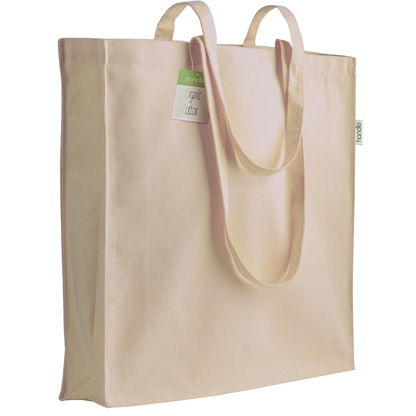 Bolsa de tela de 140 gramos con fondo ancho fabricada en algodón ecológico 100%. La bolsa Handle tiene asas largas para poder llevarla en el hombro fácilmente.