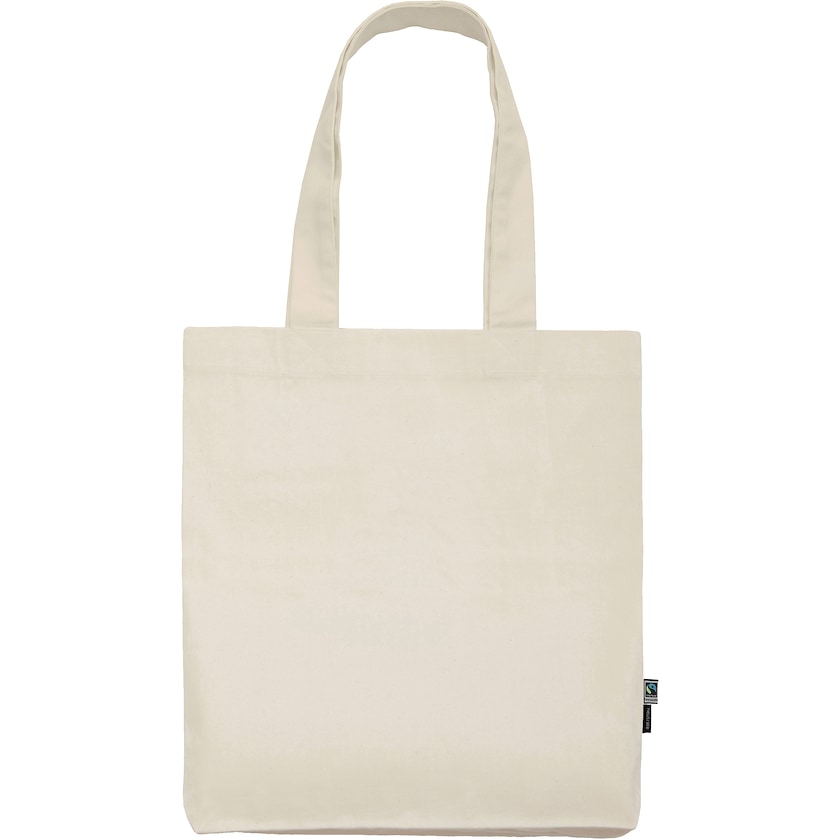 Resistente bolsa de algodón ecológico con certificado de comercio justo. El asa de la bolsa mide 66 cm. Tiene los certificados de comercio justo, EU Ecolabel, SA8000 y Oeko-Tex.