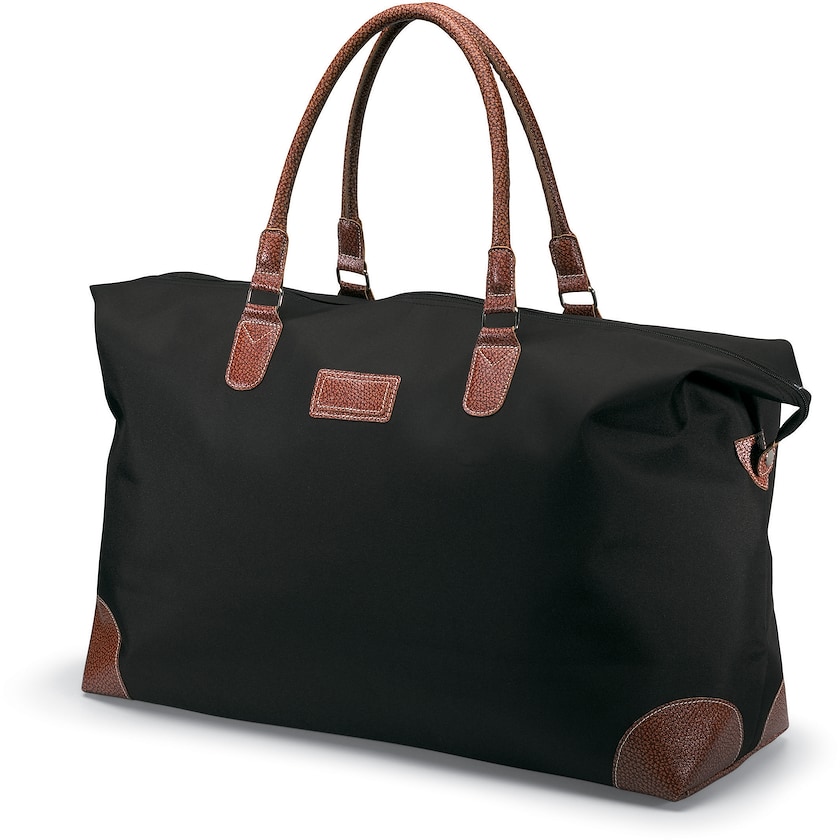 Espaciosa bolsa de viaje perfecta para escapadas cortas. El modelo Boqa está fabricado en microfibra y tiene asa y refuerzos de PVC marrón.