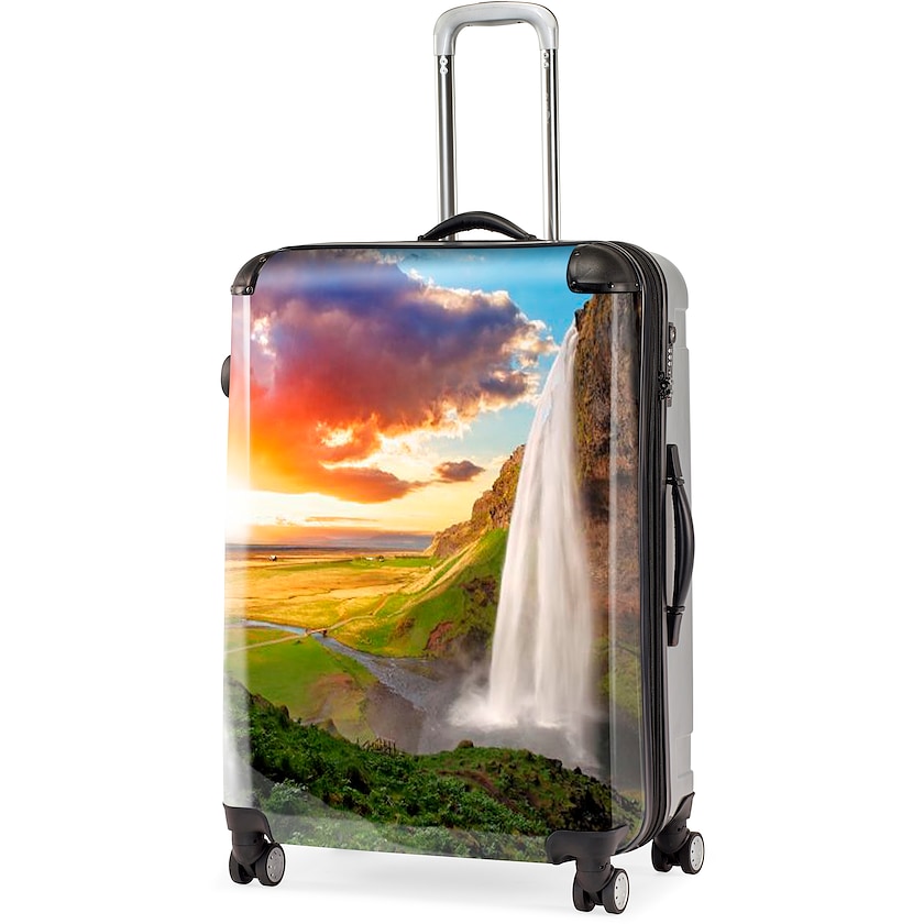 Maleta grande con impresión personalizada en la parte frontal. La maleta Cairo está fabricada en policarbonato, es ligera y resistente. Tiene 8 ruedas y candado TSA. En el interior tiene bolsillos, correas y una bolsa para ropa sucia. La maleta se puede expandir para aumentar su volumen en un 25%. La impresión se realiza en un papel fotográfico que se coloca bajo una superficie protectora transparente. La maleta tiene dos años de garantía.