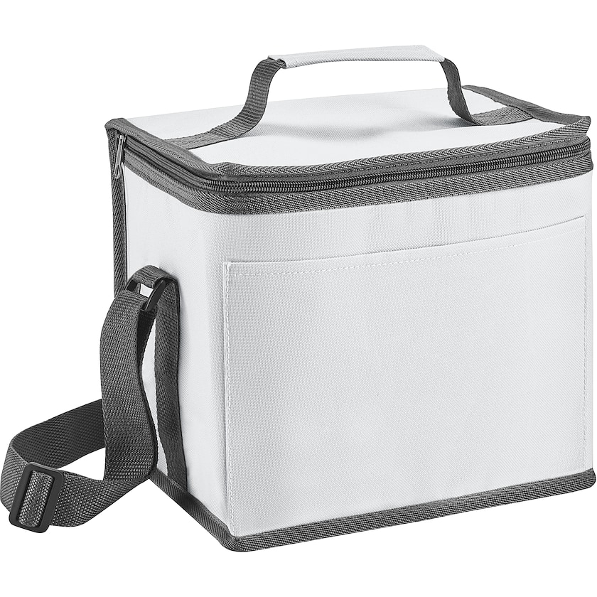 Clásica bolsa térmica con asa en la tapa. En la parte frontal hay un amplio bolsillo para objetos pequeños. La correa es ajustable.