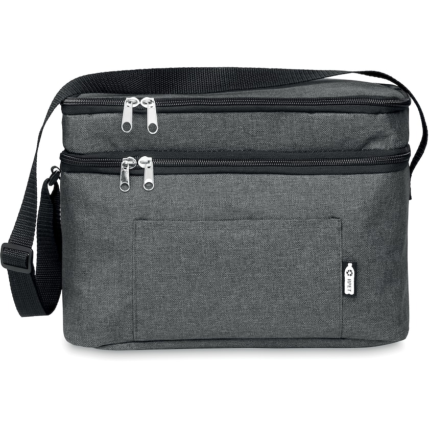 Amplia bolsa nevera ecológica personalizada. Greenland está fabricada en rPET y el forro es de PEVA. La bolsa nevera tiene dos amplios espacios y un bolsillo delantero. La correa es ajustable.