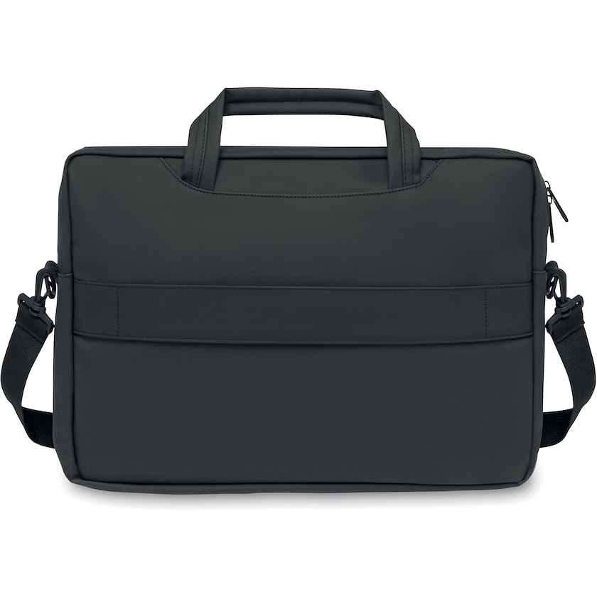 Maletín personalizado para ordenador de 15 pulgadas. El compartimento principal está acolchado y tiene un bolsillo frontal con cremallera. La correa es ajustable y extraíble. En la parte posterior tiene soporte para fijar a una maleta. Se personaliza con impresión en un color.