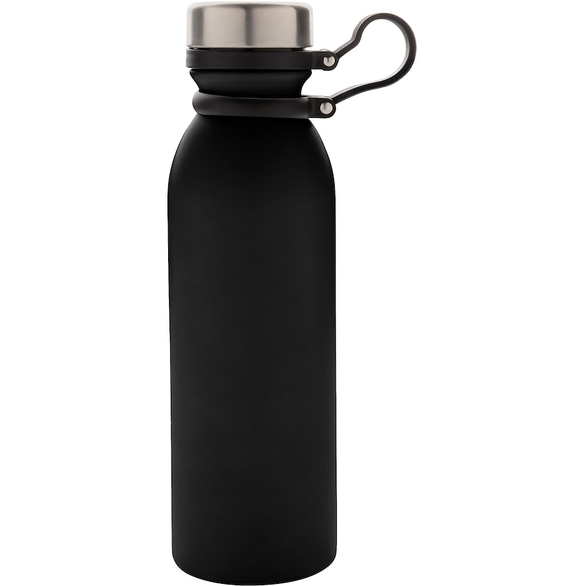 Botella de agua que también sirve como termo. La botella tiene doble pared con aislamiento de cobre para mantener la bebida caliente hasta 8 horas y fría hasta 24 horas. La tapa está unida con una correa de silicona que también sirve como asa de transporte.