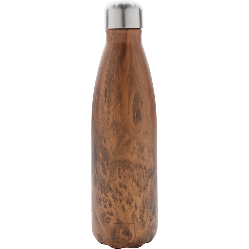 Termo de acero con bonita impresión sobre la superficie de madera. La botella mantiene la bebida fría hasta 15 horas y caliente hasta 5 horas. Una botella térmica elegante y llamativa.