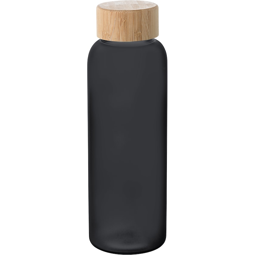 Botella de vidrio con tapón de bambú. La botella es de vidrio de borosilicato, un material refractario muy resistente. Se entrega en una caja de cartón individual. La impresión solo se puede realizar en un color.