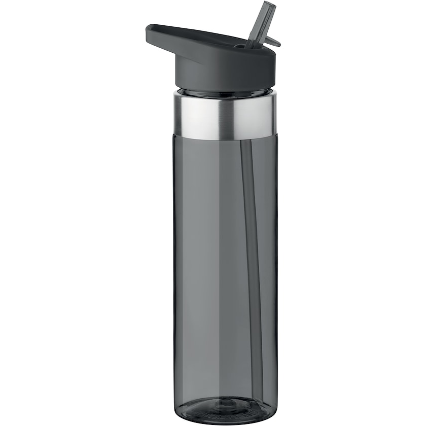 Botella deportiva moderna con boquilla. En la parte superior tiene una anilla de acero inoxidable. La botella está disponible en varios colores transparentes. La impresión se realiza en un color.
