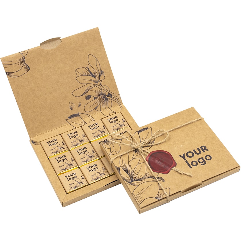 Caja grande de color natural con 12 piezas de chocolate. Tanto la caja como las chocolatinas se personalizan con tu diseño. Elige entre chocolate con leche y chocolate negro. También puedes elegir entre envoltorio dorado o plateado para las chocolatinas. La caja se entrega cerrada con cordel y una pegatina. La pegatina imita a un sello de cera roja y, si quieres, puede personalizarse con el logo de tu marca.