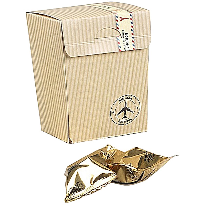 5 trufas de chocolate en caja de cartón de diseño personalizado. Las trufas se producen en Francia y son de chocolate negro de la mejor calidad. El envoltorio se personaliza con impresión digital siguiendo tu diseño. Un regalo elegante para clientes y empleados.