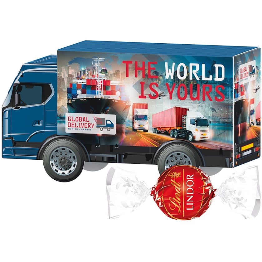 Un camión lleno de 3 bombones Lindt Lindor. Todo el exterior se imprime según tus deseos. Fabricado con papel certificado FSC.
