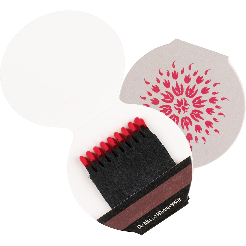 Sobre de cerillas circular con 18 cerillas. Un sobre de cerillas para los que quieren llamar la atención. En el precio se incluye la impresión en el interior. La impresión se realiza en un máximo de 4 colores de acuerdo con la escala Pantone y CMYK. Puedes elegir entre 16 colores diferentes para la cabeza y 7 colores diferentes para la madera. Compra sobres de cerillas circulares en Axon Profil.