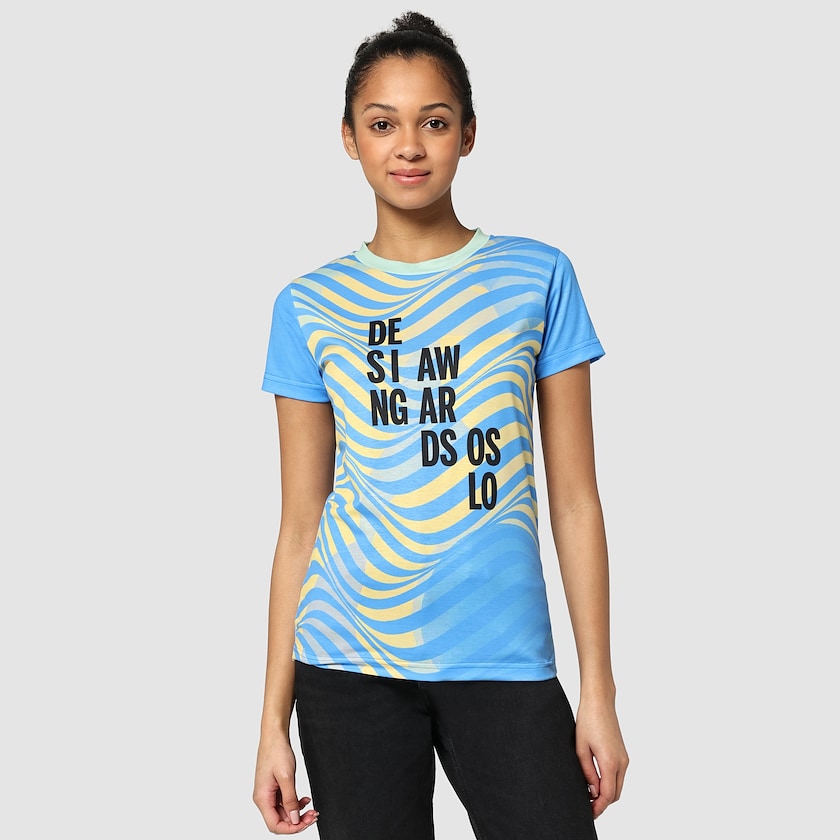 Camiseta femenina fabricada con tu diseño en poliéster con tacto de algodón. La camiseta está confeccionada con un tejido de poliéster blanco de 145 gramos. Todo el tejido se imprime digitalmente según tus instrucciones y luego se cose para formar la camiseta. Esto permite un número ilimitado de estampados, colores y diseños que cubren completamente hasta las costuras. La camiseta está disponible en tallas de la XS a la 4XL. El pedido mínimo por talla es de 5 unidades. La tolerancia de talla es de +/- 1,5 cm y nos reservamos el derecho a que la cantidad entregada pueda variar en un +/- 5 %. Se facturará la cantidad entregada. Dado que la camiseta se fabrica a medida, el plazo de entrega es más largo de lo habitual. También disponible como modelo de hombre.