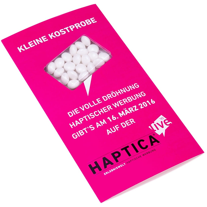 Tarjeta con blíster con pastillas de 4 gramos. Las tarjetas con blister están disponibles en varios formatos y se personalizan con impresión digital. Tú diseñas la parte frontal y la parte posterior. Las pastillas están disponibles en diferentes sabores que se pueden mezclar. Dulces personalizados con logo divertidos con gran valor publicitario.