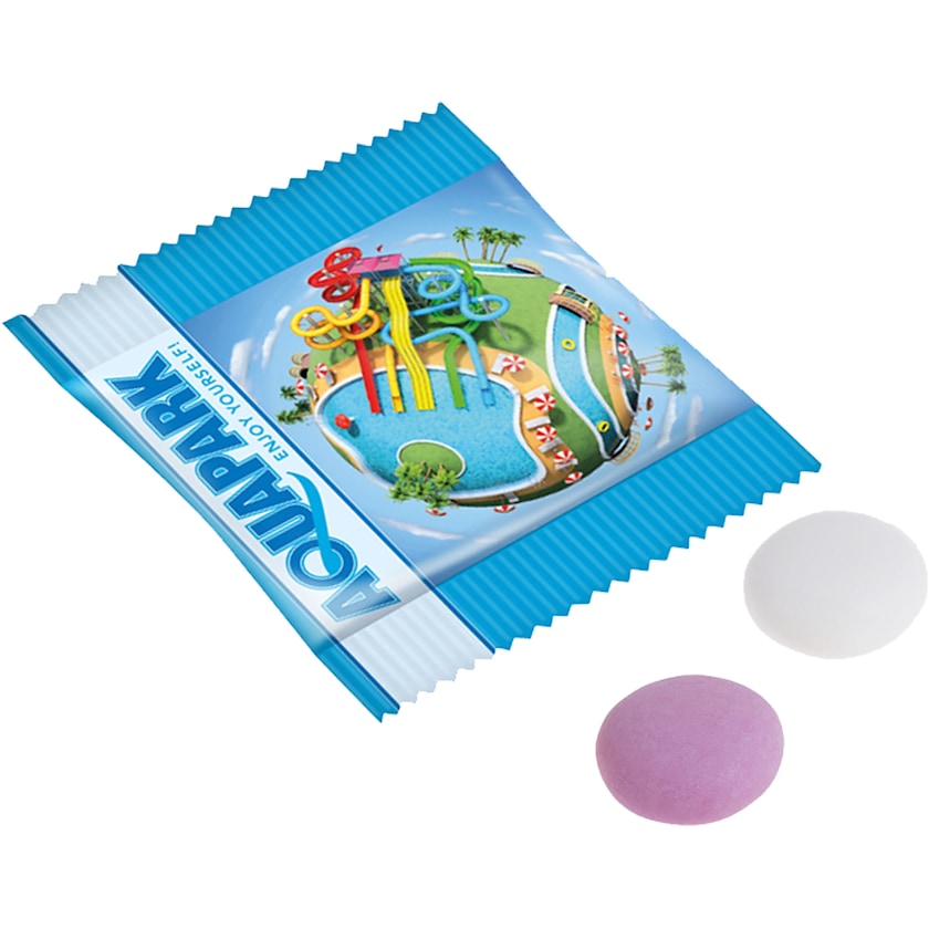 Dos Mentos en envoltorio flowpack personalizado. Elige entre Mentos de menta y de mezcla de frutas. Todo el envoltorio se personaliza con tu diseño.
