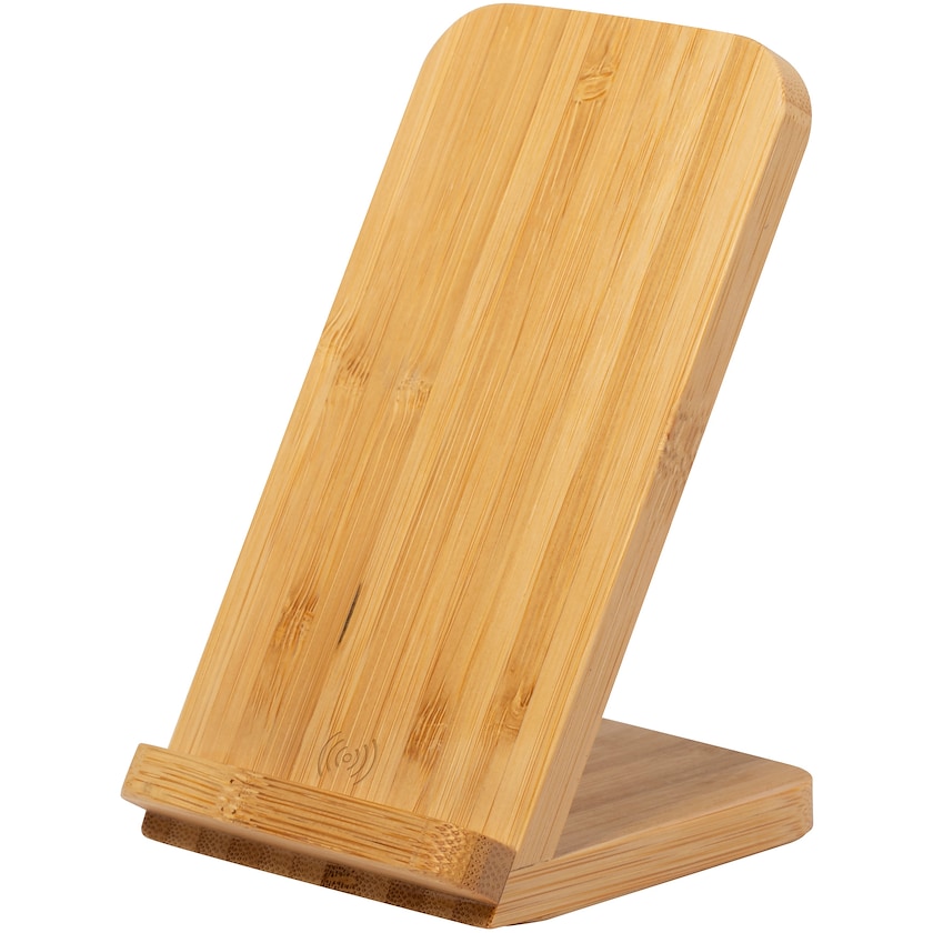 Cargador inalámbrico que también sirve como soporte para el móvil. El cargador es de bambú y tiene un diseño elegante. Output máximo 1000 mA. Cable de carga USB incluido. El marcado se puede realizar con impresión en 1 color o con grabado láser.