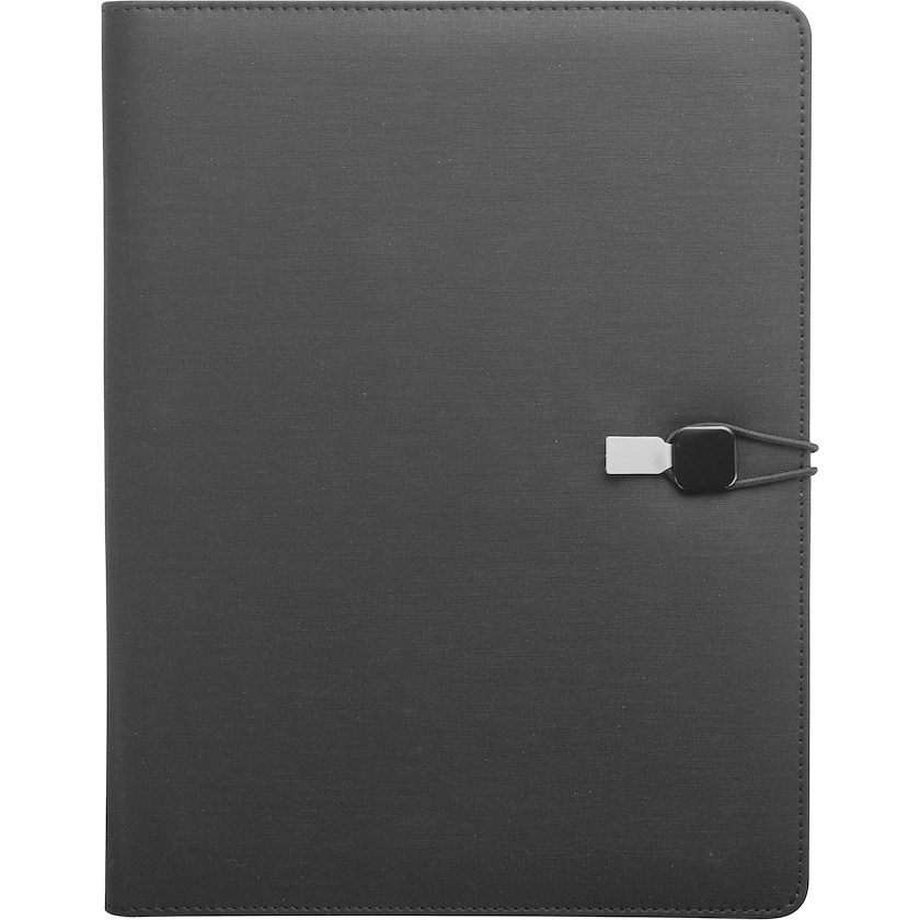 Elegante carpeta en tamaño A4 de cuero sintético. En su interior hay un cuaderno A4 recambiable, un soporte para bolígrafo y varios bolsillos. El grabado láser se realiza en el cierre metálico de la carpeta.