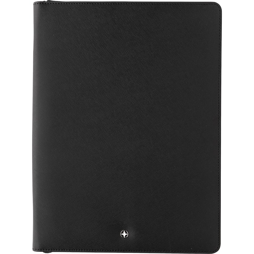 Carpeta sostenible de Swiss Peak. La carpeta está fabricada con poliuretano reciclado. En el interior hay un cuaderno con 20 hojas rayadas de papel mineral de roca sostenible.