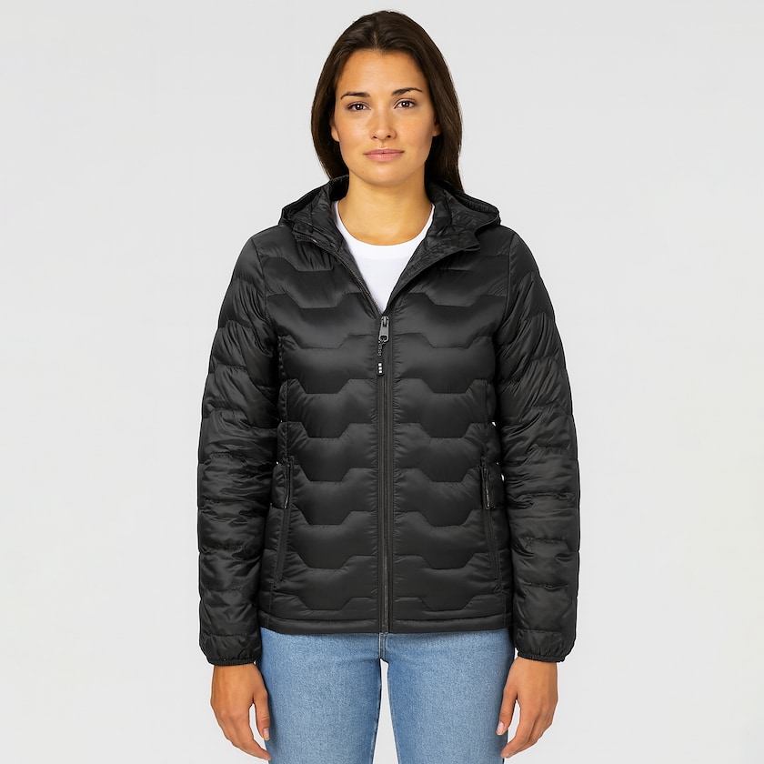 Cazadora de invierno de material reciclado para mujer. La chaqueta es de tejido acolchado de nailon reciclado. Los bolsillos laterales tienen cremalleras. Todos los detalles de la cazadora, como las cremalleras, son de material reciclado. El forro está compuesto de un 90% de plumón reciclado y un 10% de plumas recicladas. La chaqueta tiene la certificación GRS. Una cazadora exclusiva y respetuosa con el planeta. También disponible como modelo de hombre.