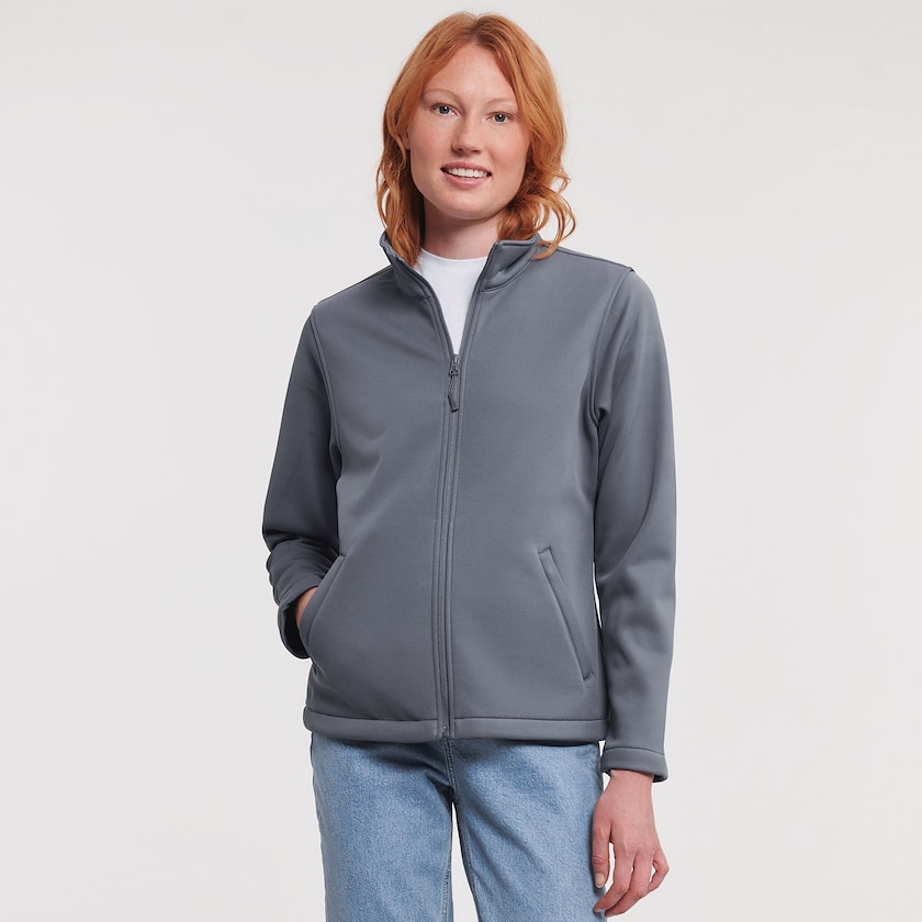 Cazadora soft shell de Russell de material transpirable para mujer. La cazadora tiene dos capas de tejido suave sin membrana, lo que la hace más transpirable. Además, tiene una superficie exterior avanzada repelente al agua de Teflón®. Tiene bolsillos con cremallera en los laterales y un agradable forro polar. También disponible como modelo de hombre.
