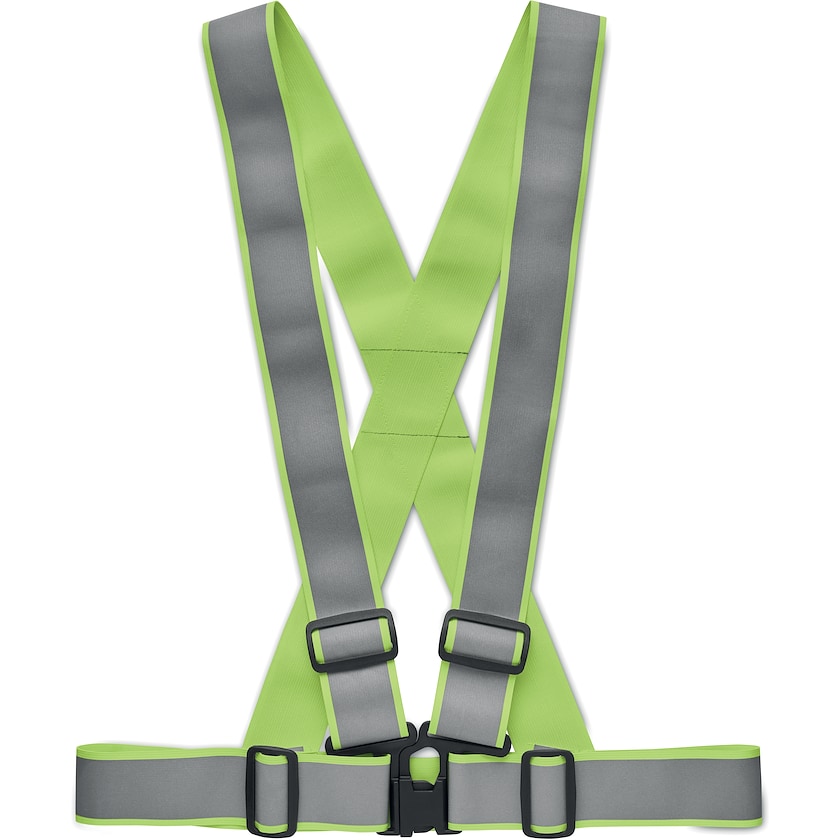 Arnés reflectante ajustable con reflectores plateados. Aprobado según EN17353:202 TIPO-B3. La impresión se hace en la hebilla del cinturón o en la parte posterior del arnés reflectante.