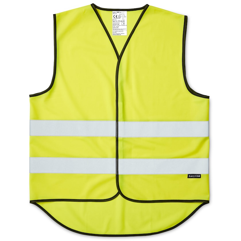 Chaleco reflectante ecológico fabricado en poliéster reciclado. Los reflectores tienen 55 mm de ancho. El chaleco se cierra con cremallera. Puedes mezclar libremente las tallas S/M y L/XL. Homologado por la CE y según EN ISO 20471:2013+A1:2016 clase 2.
