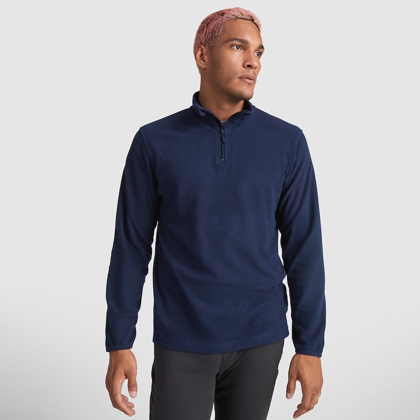 Polar económico de Roly. El jersey tiene cremallera corta en el cuello y es de un tejido muy suave con un espesor de 300 g/m2. Tiene bolsillos laterales.